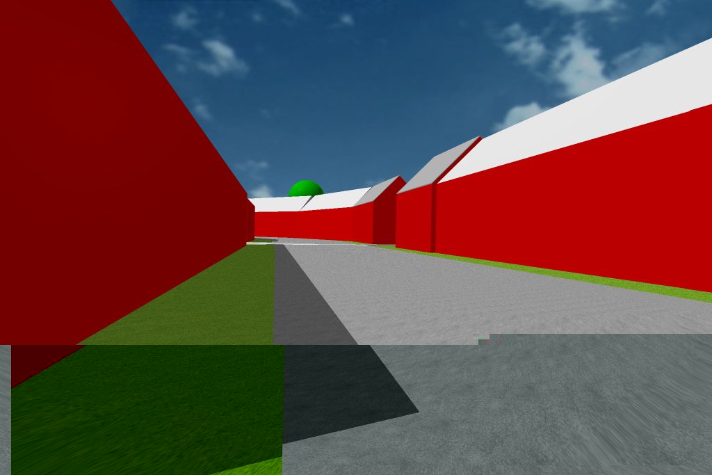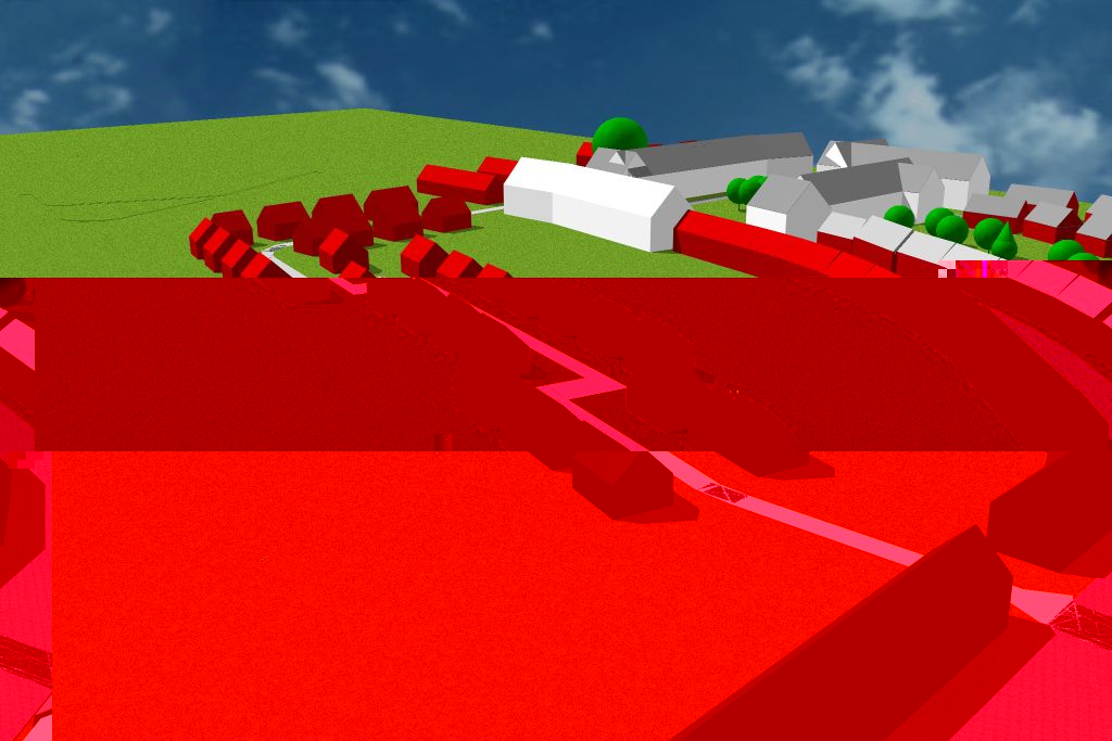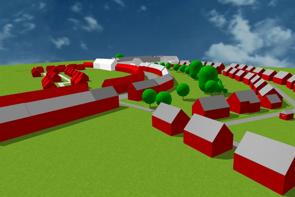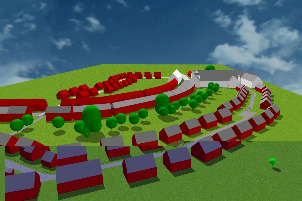 Je viens de rajouter à la simulation les maisons manquantes de la phase 2. J'ai fait juste des cubes rouges. Mais ca donne une idée de l'arrangement et de la taille probable des bâtiments.